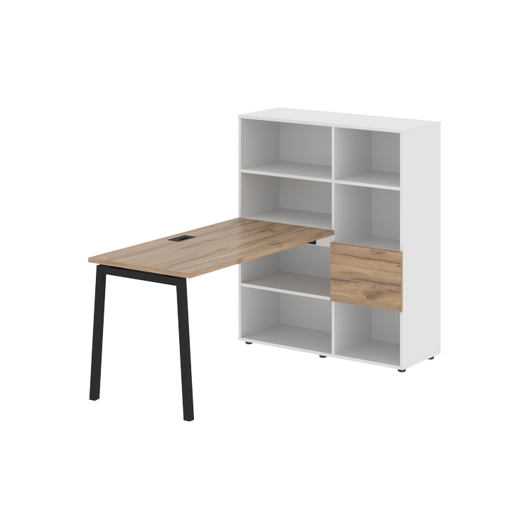 Каркасы стеллажей полностью из ЛДСП т.18 мм с кромками ПВХ т.2 и 0,45 мм, задняя стенка из ЛДСП. Комплектуется малой дверью в цвет столешницы и регулируемыми опорами h= 27 мм.