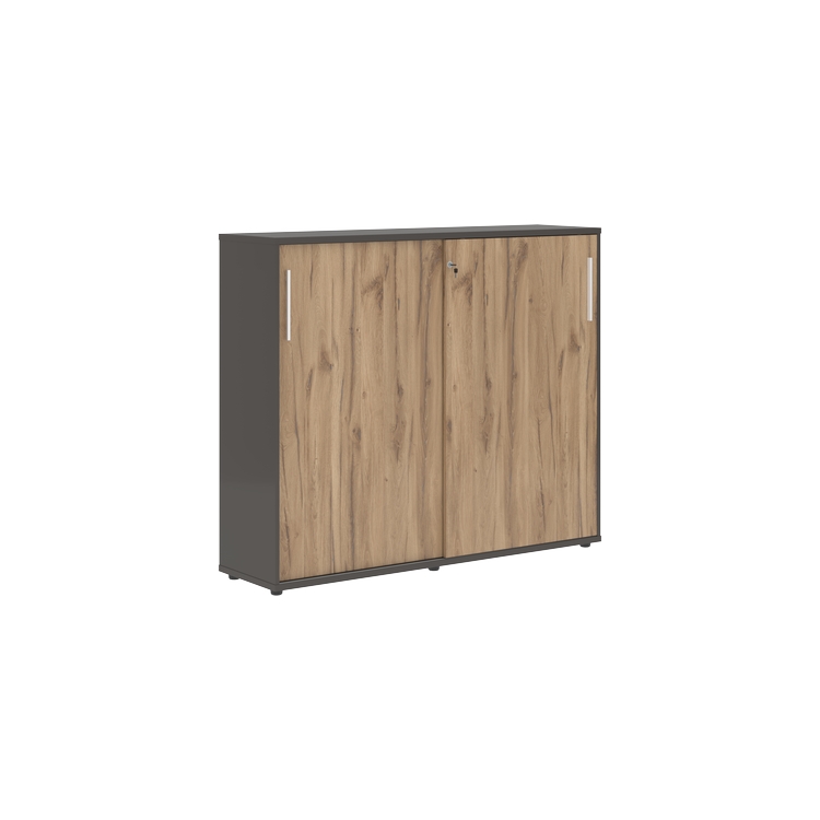 Шкаф комплектуется центральным замком для одновременного закрывания двух дверей, регулируемыми опорами h=27 мм и металлическими ручками.