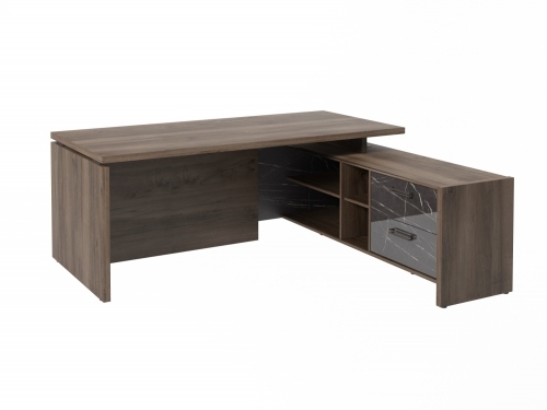 Столешница, бок стола и бок тумбы выполнены из ЛДСП толщиной 38 мм. Цвет - "Орех Пацифик Табак". Кромка 2 мм.