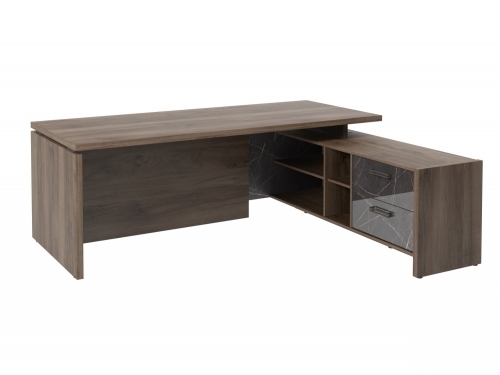 Столешница, бок стола и бок тумбы выполнены из ЛДСП толщиной 38 мм. Цвет - "Орех Пацифик Табак". Кромка 2 мм.