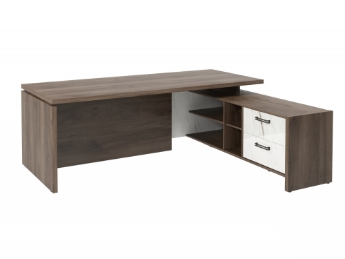 Столешница, бок стола и бок тумбы выполнены из ЛДСП толщиной 38 мм. Цвет - "Орех Пацифик Табак". Кромка 2 мм.