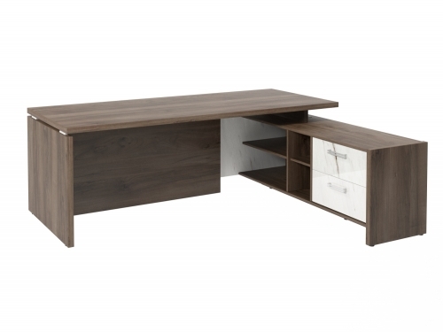 Столешница, бок стола и бок тумбы выполнены из ЛДСП толщиной 38 мм. Цвет - "Орех Пацифик Табак". Кромка 2 мм.