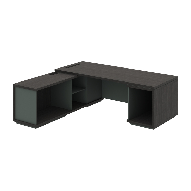 Каркас стола руководителя с опорными тумбами в левом исполнении. Столешница, фронтальный щит, верх, низ и задняя стенка большой опорной тумбы, бок малой опорной тумбы выполнены из ЛДСП Дуб Шерман антрацит 38 мм, облицованы противоударной кромкой ABS 2 мм.